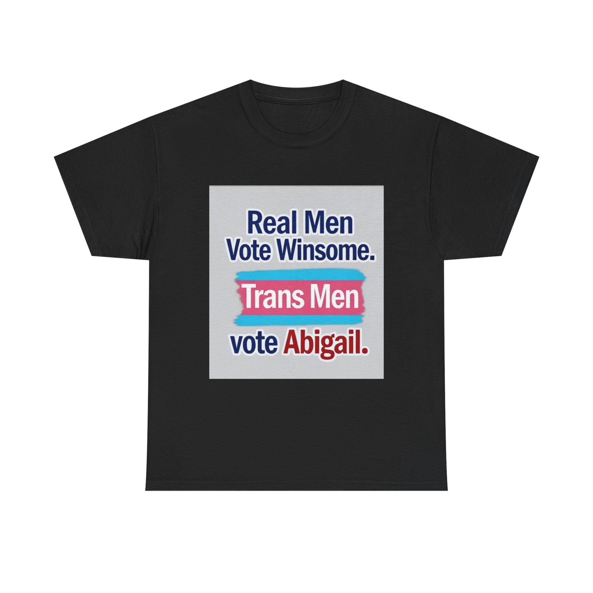 Ignite the conversation with this unapologetic Unisex Heavy Cotton Tee, crafted from Gildan 5000 premium fabric for all-day rally comfort. Front-center design in striking red and blue lettering slams home the truth: Real Men Vote Winsome. Trans Men Vote Abigail.—a direct callout to Virginia's 2025 gubernatorial showdown, where Lt. Gov. Winsome Earle-Sears champions merit and safety, while Democrat Abigail Spanberger dodges the fight on protecting women's private spaces.